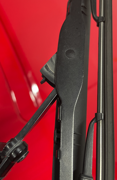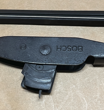 Recently, I started hearing an annoying rubbing sound at the top of my wiper blade travel on the passenger side. Upon closer inspection I found that the blade had detached from the arm as shown above. Thus, when the blade changed direction at the top of its arc, the rubber was dragging on the windscreen.